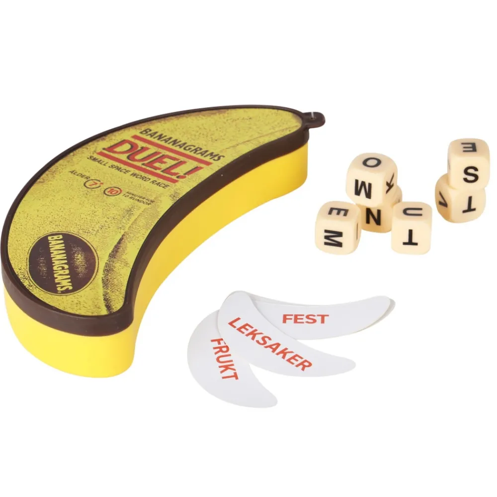 Bananagrams I MellanmalsstorlekDen Roliga Bananformade Ladan Innehaller 24 Kuber Med Totalt 144 Bokstaver. Tva Spelare Anvander Bokstavskuber I En Korsordsduell Dar Malet Ar Att Spela Ut Sina 12 Kuber Och Fa Ett Banankort Som Beloning. Forst Till 10 Banankort Vinner.
