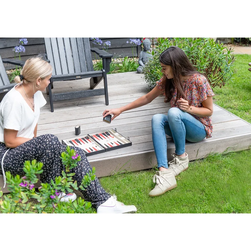Ett Mycket Prisvart Backgammon I Svart Ladervaska.Ett Backgammon Som Ar Latt Att Ta Med, Da Det Kommer I En Vaska Kladd I Svart Pu-Lader. Invandigt Kladd I Beige Filt Med Svart Och Rott Tryck. Innehaller 4 Tarningar, 1 Dubblingstarning, 30 Marker, 2 Tarningsmuggar Och Instruktionsbok.