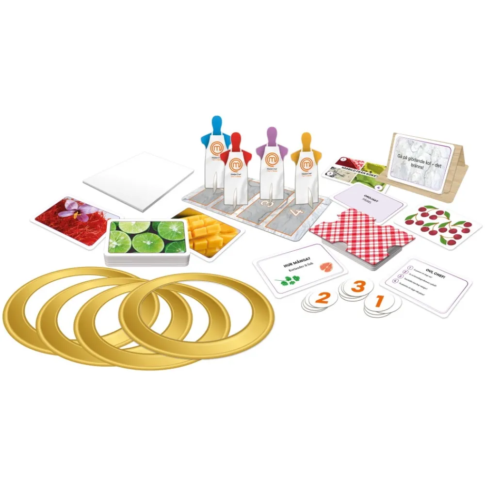 150 Kort, Poangtavla, 4 Figurer Med Masterkocksforkladen, 4 Papptallrikar, 12 Poangbrickor, 1 Korthallare, 1 Duk-Kort, 1 Tomt Anteckningsblock, Regler