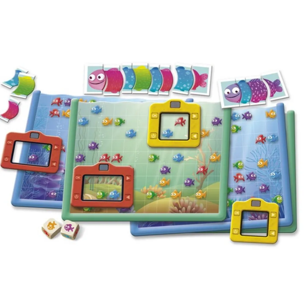 Kasta Tarningen Och Anvand Kameraramen For Att Hitta Ratt Fisk Pa Spelbordet Som Visas Pa Tarningen. Spelaren Som Snabbast Hittat Ratt Bild Kan Lagga Till En Stor Bit Till Sin Fisk. De Andra Spelarna, Som Ocksa Hittat Ratt Bild, Kan Lagga Till En Mindre Bit. Vinnaren Ar Den Spelaren Som Snabbast Samlat Ihop Delar Till En Hel Fisk, Som Ar Langre An Akvariet. Spelet Har Flera Olika Svarighetsnivaer Och Kan Spelas Med Antingen En Liten Eller En Stor Kameraram. Spelbordet Har Ocksa 2 Olika Sidor – Den Ena Ar Svarare An Den Andra. Man Kan Ocksa Valja Att Den Svara Sidan Ska Vara Till De Vuxna Och Den Latta Sidan Ska Var Till Barnen.