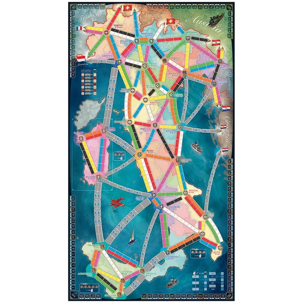 Valkommen Till Ticket To Ride Italien. Ak Genom Landsbygden Och Njut Av Alpgloden Pa De Majestatiska Bergstopparna Och Se Solen Ga Ner Bakom Cypresshackarna I Toscanas Fantastiska Landskap. Du Kan Ocksa Hoppa Ombord Pa En Farja Till Sicilien Eller Nagra Av Grannlanderna … Men Glom Inte Bort Varfor Du Ar I Italien. Kan Du Bygga Det Mest Imponerande Tagnatverket Och Koppla Ihop Flest Regioner I Landet?