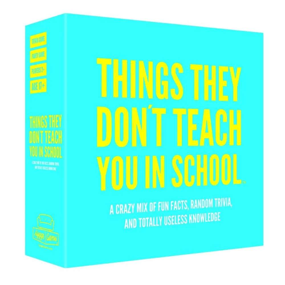 Spelet Things They Don´T Teach You In School Ar Absolut Inte Ett Traditionellt Fragespel Med Trista Och Trotta Fragor Om Vem Som Skrev Bockerna Om Sherlock Holmes Eller Var De Olympiska Spelen Holls 1996. Det Har Ar Istallet Spelet Om Allt Det Dar Man Inte Fick Lara Sig I Skolan? Over 400 Hysteriskt Galna, Knasiga, Bisarra Och Totalt Meningslosa Men Anda Superintressanta Och Underhallande Fragor Som Ar Lika Kul Att Kunna Svara Pa Som Att Hora Svaret Pa! Det Perfekta Spelet For Alla Som Alskar Meningslost Vetande Blandat Med Nonsens Och Massor Av Humor!