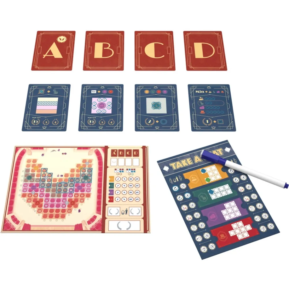 Take A Seat Introducerar En Innovativ Mekanism Kallad Share & Write Dar Slumpmassigheten Skapas Av Spelarinteraktion. Varje Tur Kommer Spelare Att Fa En Reservationspanel Och De Maste Bestamma Om De Ska Anvanda Vaktmastarens Formaga Eller Fa Direkta Poang. Sedan Maste De Markera En Reservation I Tavlan Till Hoger Eller Vanster Genom Att Skrapa Pa Nagon Av De Fyra Biljetterna I Reservationspanelen. Slutligen Maste De Tilldela Platser Pa Teatern Genom Att Markera Konturerna Och Cirklarna Som Motsvarar De Valda Bitarna I Foregaende Steg.